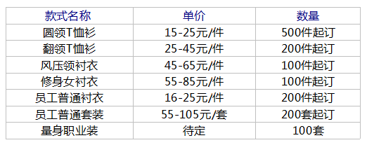 工作服是多少錢一件?我們的客服不知道怎么來面對客戶的詢價,你們的工作服是多少錢一件?所以我們只有做一份參考價格表來供大家參考!希望能幫到大家!