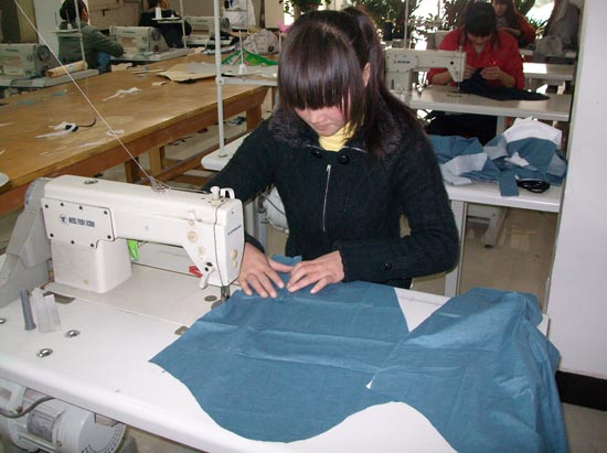五、工作服的縫制:在針距密度中規(guī)定明線(包括不見明線的暗線)的針距,每3cm 14—18針。面料的品種很多,為保證產(chǎn)品的外觀和牢固,不同的面料應(yīng)選不同的針距。如硬質(zhì)面料的針距可以稀一點,質(zhì)地松軟的面料針距可以密一點。縫制部位的線路不準(zhǔn)隨便彎曲,要符合工作服的造型的需要;線路要整齊,不重疊,無跳針、拋線,針跡清晰好看,縫制的起止回針要牢固,搭頭線的長度要適宜,無漏針、脫線現(xiàn)象,縫線松緊要與面料厚薄、質(zhì)地相適應(yīng)。