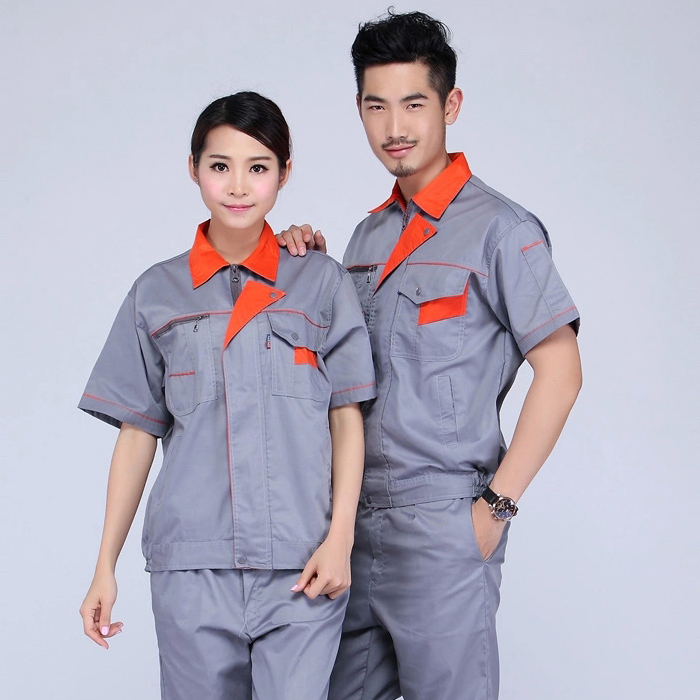JL-XJ115夏季工作服主色深灰色配橘黃,主色淺灰色配藏藍色高品質全新形象,經典設計,立體裁剪,時尚翻領,質感有型。走線細致,實用性強。插袋撞色拼接,雙明線縫制既時尚又耐用,即使在下班之余也可以穿。